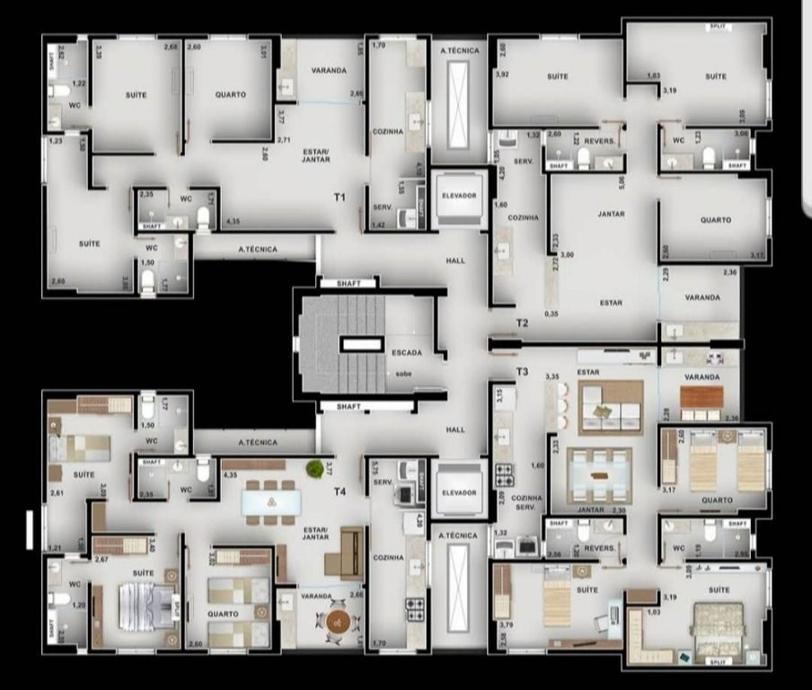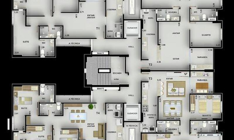 Apartamento com 3 quartos sendo 1 suítes sendo 1 reversível, wc social reversível, sala para 2 ambientes com varanda, cozinha, área de serviço e 2 vagas de garagem.